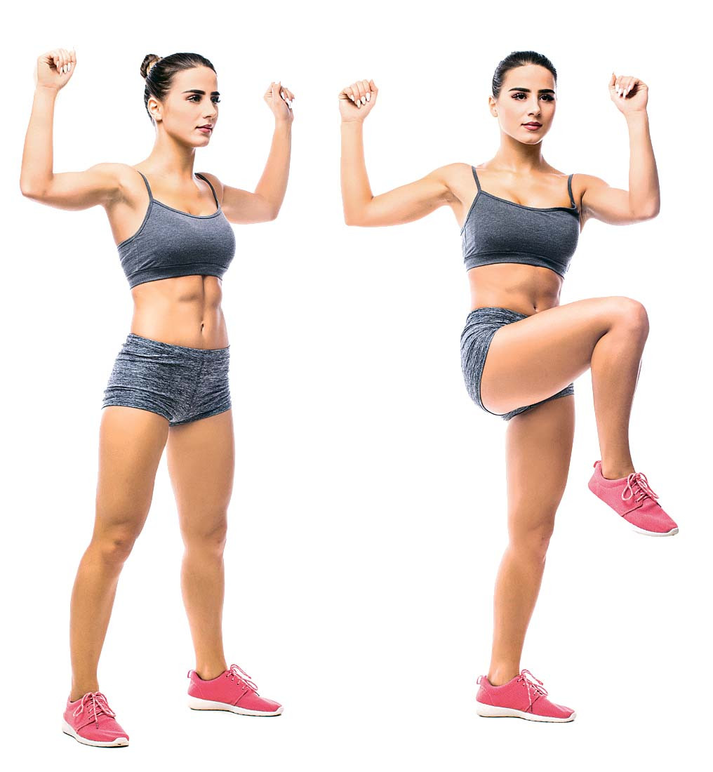 Подними одно колено, сохраняя ось с бедром, направь на выдохе противоположный локоть к колену, при этом не наклоняй корпус.