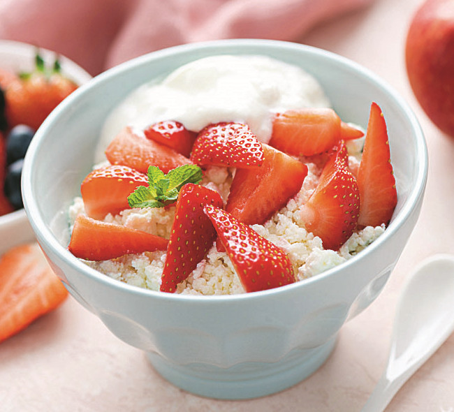 Отличный и полезный способ дневного перекуса. Оптимальным вариантом для диетического ланча может стать творог 3% жирности (в 100 г содержится всего 80 ккал). Можно добавить орехи, фрукты и ягоды, получится вкусно и полезно.
