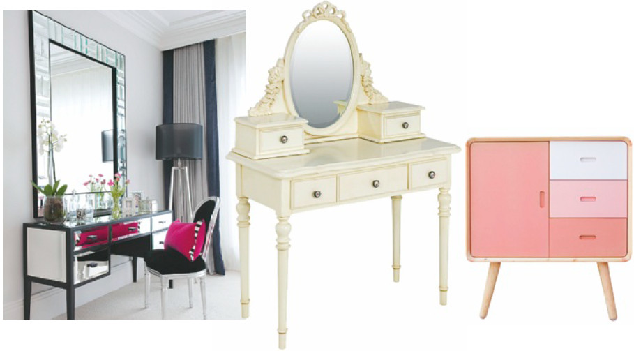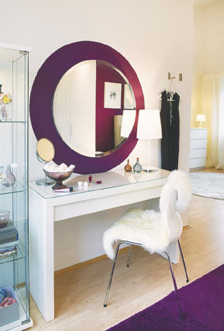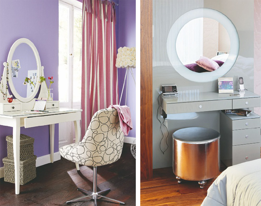 В классический набор мебели для спальни уже входят зеркала – трельяжи или трюмо. Сегодня в продаже есть огромный ассортимент зеркал. Если у тебя не трюмо, в конструкцию которого уже входит зеркальная часть, самый простой вариант – повесить обычное зеркало на стену над столешницей. Его дизайн – вопрос общего стиля комнаты. Например, для классики и винтажа подойдет массивная окантовка из дерева или в фактуре драгоценного металла, для ар-деко – позолоченное «солнце» и другие декоративные формы. Минимализм вообще не требует рамы или она должна быть очень лаконичной. Существуют туалетные столики, в которых зеркало можно выдвинуть прямо из столешницы и после использования задвинуть обратно в специальный паз.
