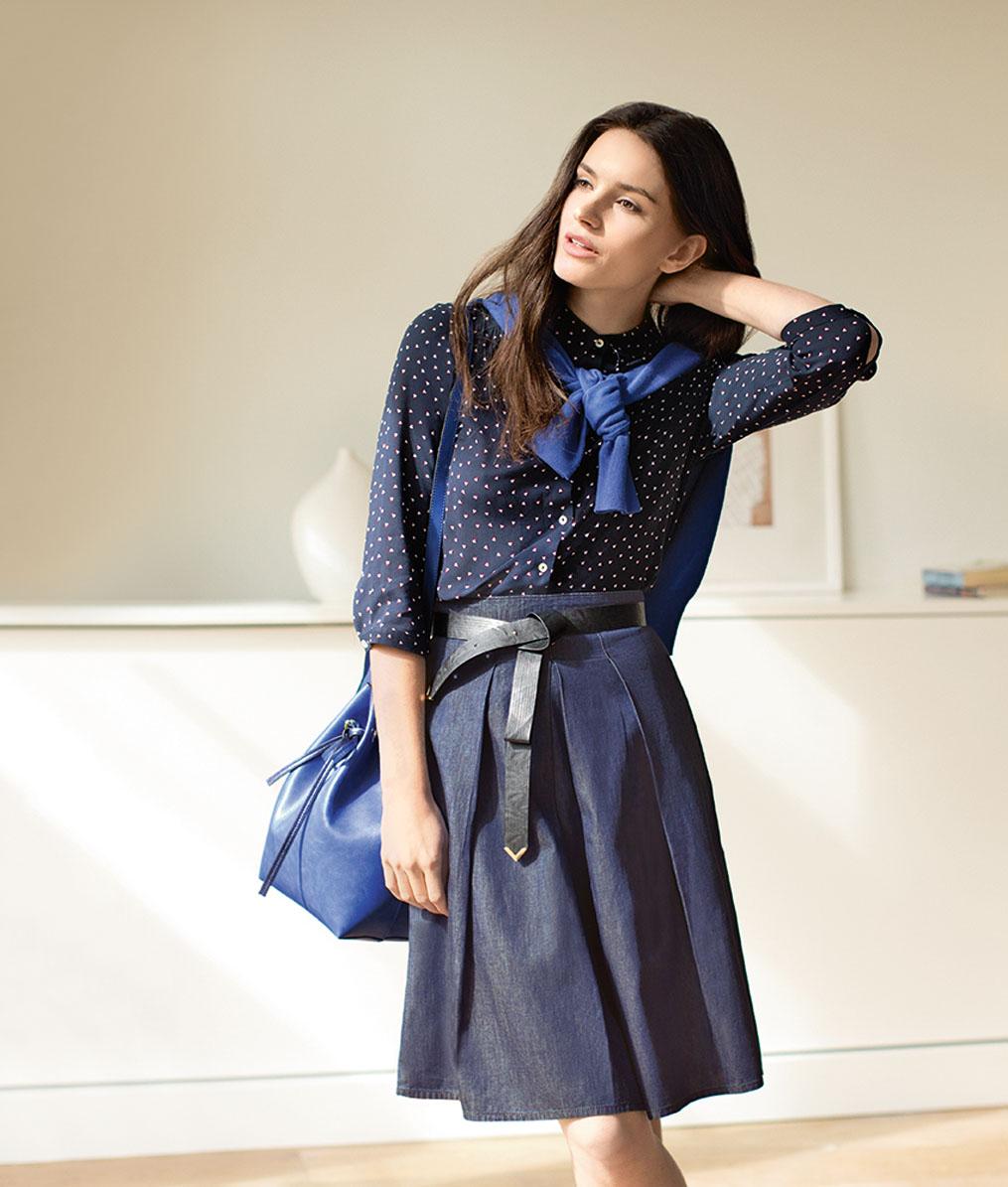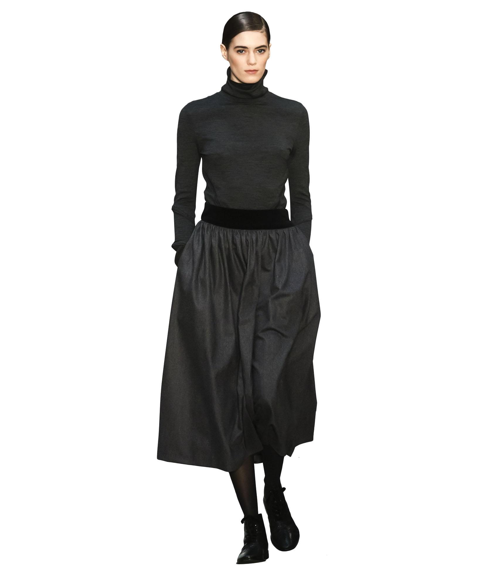 Свободная юбка длиной ниже колен заиграет в сочетании с водолазкой в тон или жакетом. Попробуй примерить темные тона.