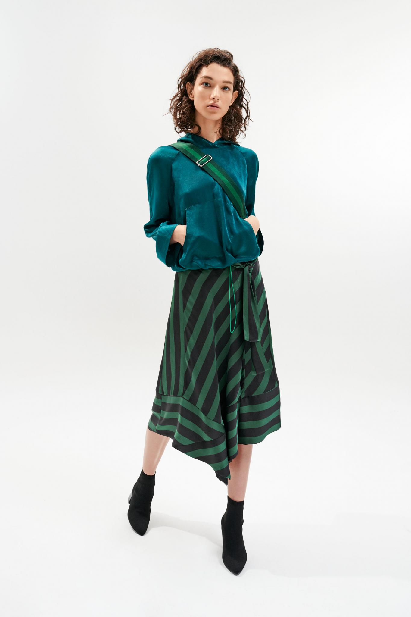 Создай образ в стиле спорт-шик с яркой трикотажной юбкой асимметричного кроя в полоску – неровные по длине края придадут наряду оригинальность, а геометрический принт визуально вытянет силуэт. Дополни юбку толстовкой в той же цветовой гамме и невысокими темными ботильонами.