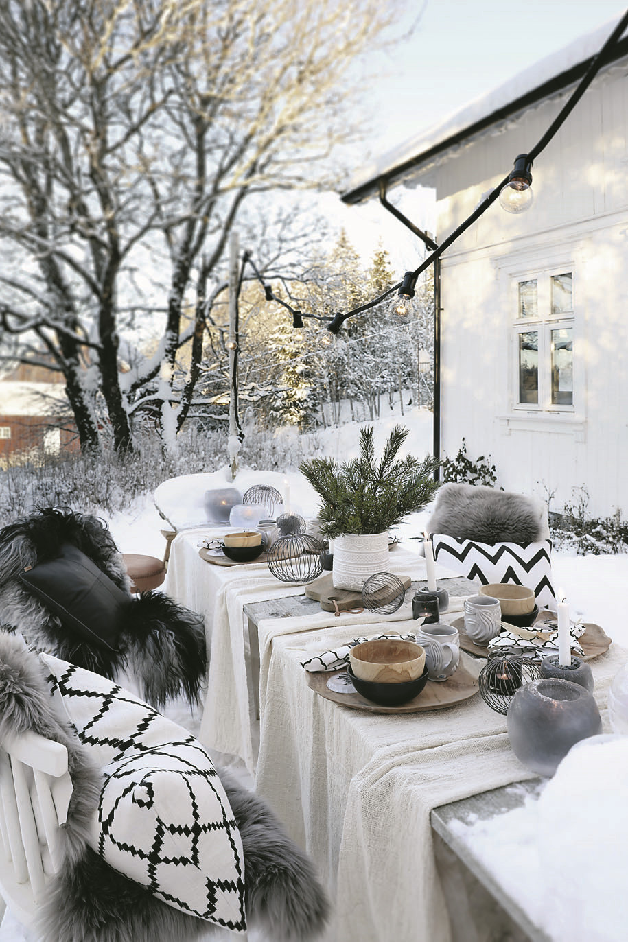 Лучше всего для зимней вечеринки подойдут пластиковые столы и стулья или мебель из металла с антикоррозийным покрытием. Чтобы гостям за уличным столом было комфортно, положи на стулья большие мягкие подушки, приготовь шерстяные пледы и, если это беседка или шатер, поставь обогреватели (газовые, электрические или инфракрасные). Если ты установила тканевые или полиэтиленовые экраны для дополнительной защиты от холодного воздуха, они же сработают и на удержание тепла.