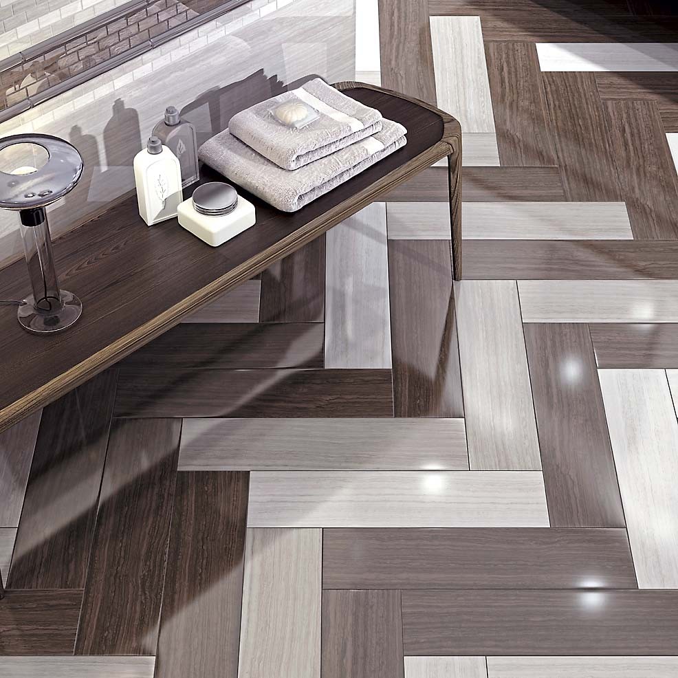 Рисунок «елочка» на керамической облицовке, в отличие от традиционного деления плоскости пола и стен на квадраты, смотрится интереснее. Комбинации узких и длинных элементов, отличающихся цветом, фактурой, степенью глянца, образуют красивые и сложные декоры. Думаешь, как подобная отделка будет вести себя в реальной жизни под воздействием паров, пыли и т.д.? Отлично. Однако все же не стоит использовать абразивные вещества и содержащие кислоту. Наиболее рискованные зоны – декоры, изготовленные с применением золота, платины, красителей на основе металлов.