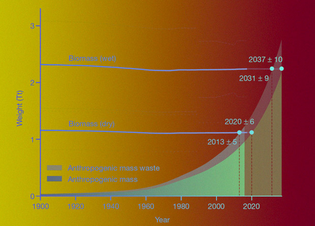 Масса предметов, произведенных людьми, например, зданий, дорог и машин, в этом году впервые превысила сухую массу всех живых организмов на планете. Так, по состоянию на 2020 году масса пластика больше, чем масса всех животных включая людей, а здания и дороги весят больше, чем все деревья и кустарники. Интересно, что в начале XX века антропогенная масса составляла всего три процента от сухой биомассы, однако благодаря стремительному росту она превзошла ее. Если тенденция продолжится, то к 2040 году созданные людьми объекты втрое превысят сухую биомассу по весу, отмечается в статье для журнала Nature.