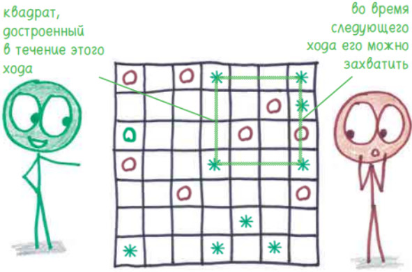 5. Когда пустых клеточек не остается, у каждого игрока есть шанс захватить еще один квадрат. После этого незамеченные квадраты не идут в счет. Выигрывает тот,