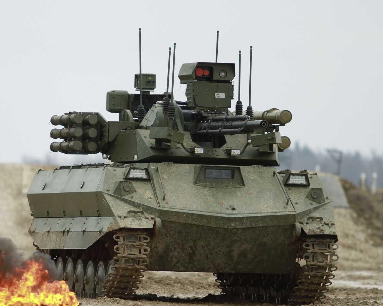 Разумеется, опыты создания машин подобного рода проводились и в других странах, да и после Победы исследования отнюдь не прекратились. В России одним из разработчиков стало как раз то самое 766 УПТК из Нахабина, приступившее к созданию линейки под общим наименованием «Уран». Имя «Уран» было придумано, чтобы подчеркнуть необычность разработки. Так называется и уникальный радиоактивный химический элемент из таблицы Менделеева, и отличная от прочих в Солнечной системе ярко-голубая планета (она даже изображена на рекламном логотипе 766 УПТК). Такое кодовое обозначение имела и победоносная Сталинградская наступательная операция Красной армии. В ряду «Уранов» на сегодняшний день есть уже три серийные машины среднего весового класса: дистанционно управляемая машина разминирования «Уран-6», пожарный «Уран-14» и, пожалуй, самая интересная машина – робот разведки и огневой поддержки (РРОП) в составе боевого многофункционального робототехнического комплекса (БМРК) «Уран-9».