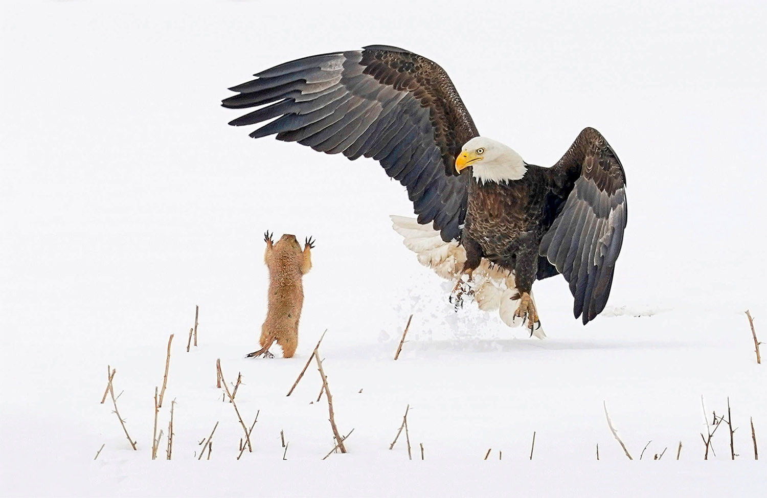 Сперва об актерском дуэте. Белка, похожая на сурка – это так называемая луговая собачка. А белоголовый орлан – это белоголовый орлан. Хищник промахнулся, пикируя на добычу. Теперь грызун корчит угрожающие рожицы и выигрывает время, чтобы спрятаться в норе. Нору не видно. А она есть. Орлану предстоит трудный разговор: «Почему дома нет еды? Небось, опять весь день на диване валялся?»