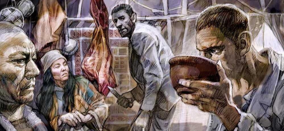 Дело в том, что Жданок и Тэнно – заключенные Дальнего лагеря МВД (Особлаг № 11, только что образованный на базе 6-го отделения Песчаного лагеря в Казахстане). Вечер своего единственного выходного они проводят за бараками, на пустыре, заросшем мягкой травой. Почему так странно одеты? Да потому, что оба – активные участники местной самодеятельности. В бараке они сказали, что пошли на репетицию сценки, для которой им и выдали костюмы. Картузы и телогрейки с номерами на спине, тем не менее, надели по форме. Однако в культурной части они так и не появились, залегли лениво на травке. Лагерь еще только строится, еще нет постоянных заборов, просто несколько рядов колючей проволоки, еще не вытоптана степь, и сейчас эта полянка, освещенная заходящим солнцем, кажется почти идиллическим уголком.