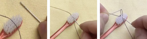 Одну иголку положи ушком на нитку вдоль. Другой подцепи нитку со щетины и протащи в ушко первой иглы. Так же, кстати, можно вдевать и тонкую леску в ушко рыболовного крючка.