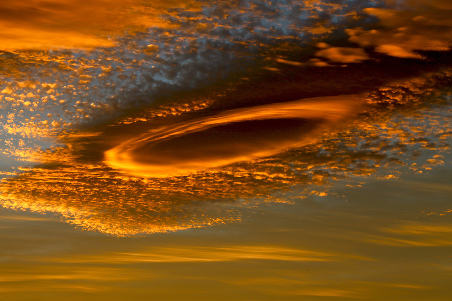 Лентикулярное облако. Посмотри, не найдется ли там же, на горизонте, пары горных пиков. При высокой влажности и сильных воздушных потоках с подветренной стороны гор образуются облака, похожие на линзы, и стоят на месте между потоками воздуха.