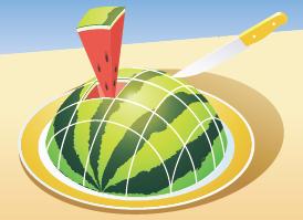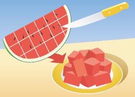 Снова разрежь арбуз на четвертинки или используй те, что остались от предыдущего эксперимента. Возьми одну, наруби на ней дольки шириной в сантиметр. Затем глубоко прорежь мякоть вдоль с каждой стороны двумя-тремя параллельными линиями. А после подрежь мякоть вдоль корки по всей ширине и длине. Теперь переверни над тарелкой – туда высыпятся кубики мякоти. В них можно воткнуть зубочистки. Ешь по кубику, смакуя тонкие ноты фруктозы. Это быстро надоест, и съешь мало.