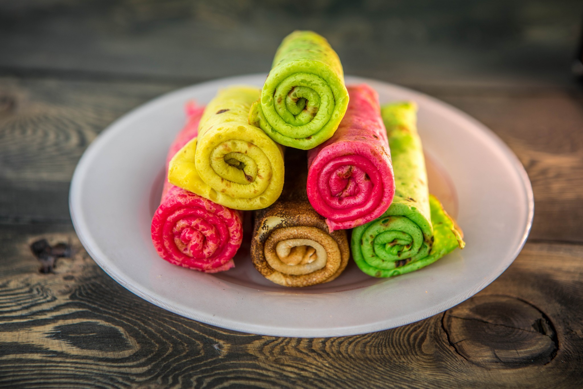 Раздели блинное тесто на несколько частей и в каждую добавь краситель. Для красных блинов подойдет свекольный сок, для черных – чернила каракатицы (продаются в готовом виде; раньше были итальянские, сейчас наверняка белорусские), для зеленых – сок шпината, для желтых – куркума или натуральный шафран, для фиолетовых – черничный сок.