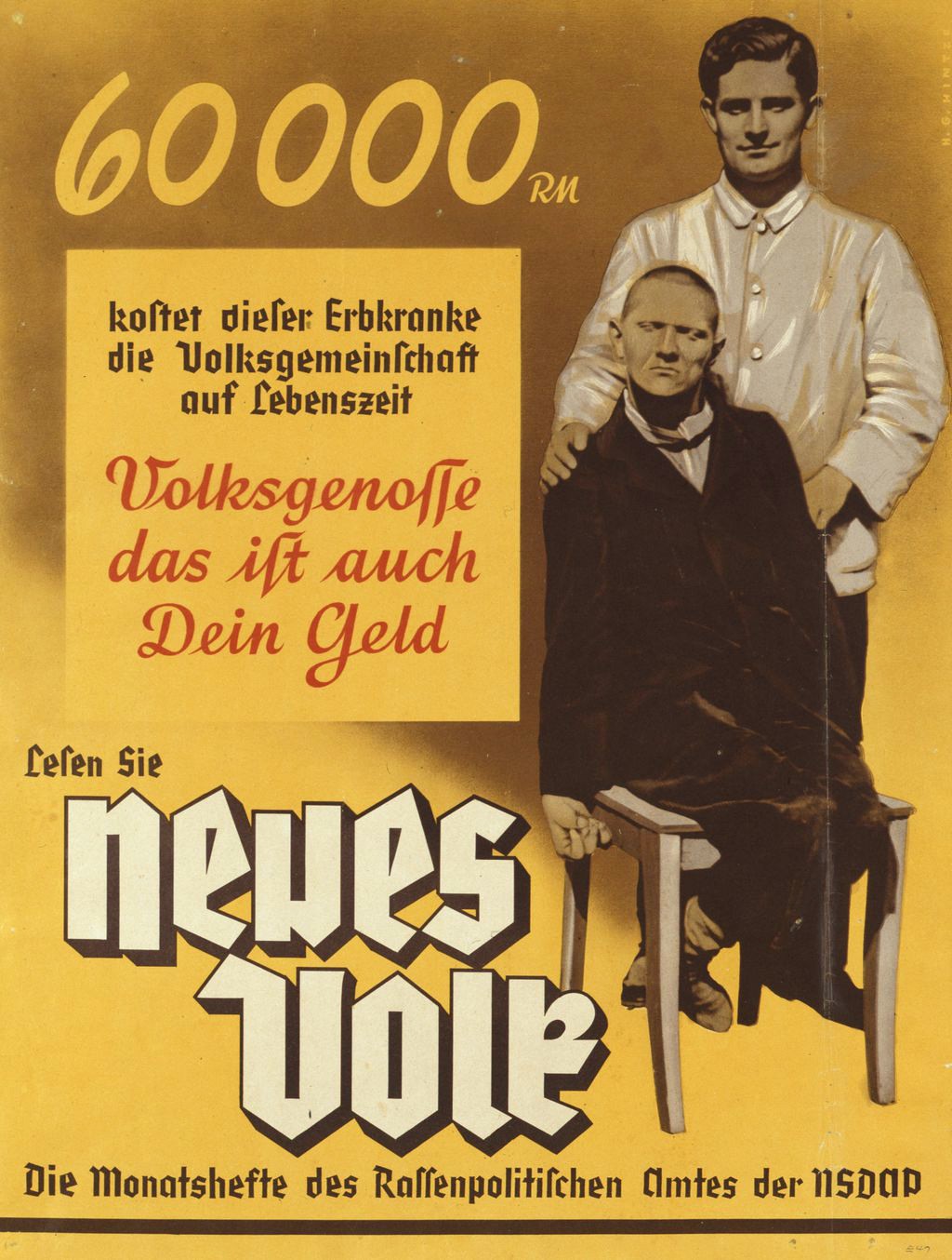 Уже с 1935 года в Германии принудительно стерилизовали лиц с генетическими болезнями и душевными расстройствами, дабы они не портили своими сомнительными генами арийскую нацию. Но настоящий размах дело «дезинфекции» приобрело к концу десятилетия, когда по всей стране стали аккуратно и без лишнего шума убивать детей с синдромом Дауна и ДЦП, паралитиков, шизофреников, калек, стариков с деменцией и так далее. Прежде всего, конечно, жертвами стали пациенты государственных клиник и приютов – их родным просто сообщали о смерти пациента, не называя причины. Потом «балласт общества» начали забирать уже и из семей. И вот тут было много некрасивых сцен, потому что некоторые нестойкие духом арийские матери и дочери вместо того, чтобы с энтузиазмом поучаствовать в освобождении общества от ненужных расходов на бесполезных людей, выли, кусались, прижимали к сердцу своих выродков и не давали выкатывать на улицу коляски со своими неходячими дедушками. Именно для того, чтобы эти глупые женщины, а также их родственники и соседи обрели должный уровень политической сознательности, и печатались красивые плакаты, наглядно объяснявшие, как отягощает великую Германию этот никчемный человеческий материал.