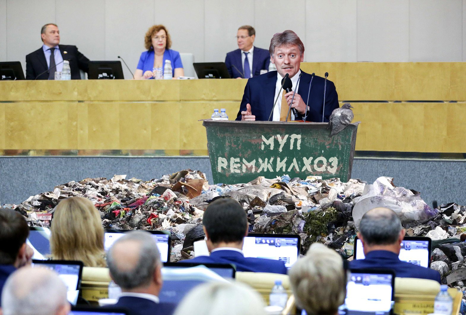 Готовясь присутствовать на совещании, наша редакция послала запрос в администрацию президента, чтобы узнать его позицию по данной проблеме, и даже получила ответ: «Это вопрос комплексный, решать его следует не торопясь, выслушав все стороны, и найти максимально удовлетворяющий всех компромисс. Пожалуйста, не отвечайте на это письмо, оно отправлено роботом». К счастью, перед встречей нам удалось отловить Дмитрия Пескова и уточнить, что же конкретно имелось в виду. «Не надо выносить сор из избы», — многозначительно ответил нам Дмитрий Сергеевич. «То есть не надо вывозить мусор в Архангельск?» — переспросили мы. «Чем дальше в лес, тем больше дров!» — пояснил свою мысль пресс-секретарь, одновременно кивнув и отрицательно покачав головой.