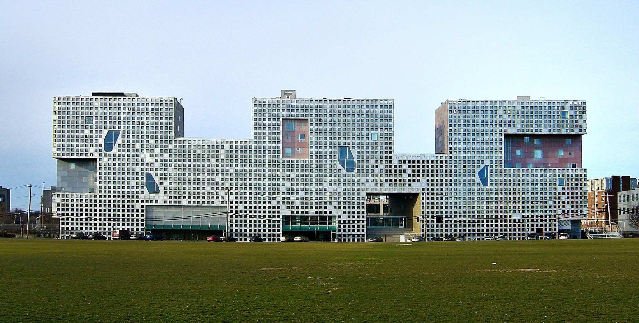 Антигерой соцсетей и архитектурных форумов – общежитие в знаменитом Массачусетском технологическом институте в пригороде Бостона. Студенты, живущие в корпусе Симмонса, возведенном в начале 2000-х по проекту Стивена Холла, вслух и даже в официальной переписке называют здание «sponge» – «губка для мытья посуды». От такого прозвища не отмоешься! Архитектор негодует: и чем они недовольны? Ведь кампус спроектирован таким образом, чтобы отказаться от общих санузлов. Там есть прачечная, фотолаборатория и даже ночной клуб. Пользователи и не спорят. Нападки вызывает внешний вид здания, похожий на губку благодаря фасадам из металлических панелей с мелкой разбивкой окон. Архитектор наивно предполагал, что будет считываться образ перфокарты, а ночью – из-за разноцветной подсветки – кубик Рубика. Уродуют дом и вставки из стекла в виде асимметричных «заплат». В таком общежитии студентам и пиво, и секс поперек горла встают – приходится готовиться к сессии.
