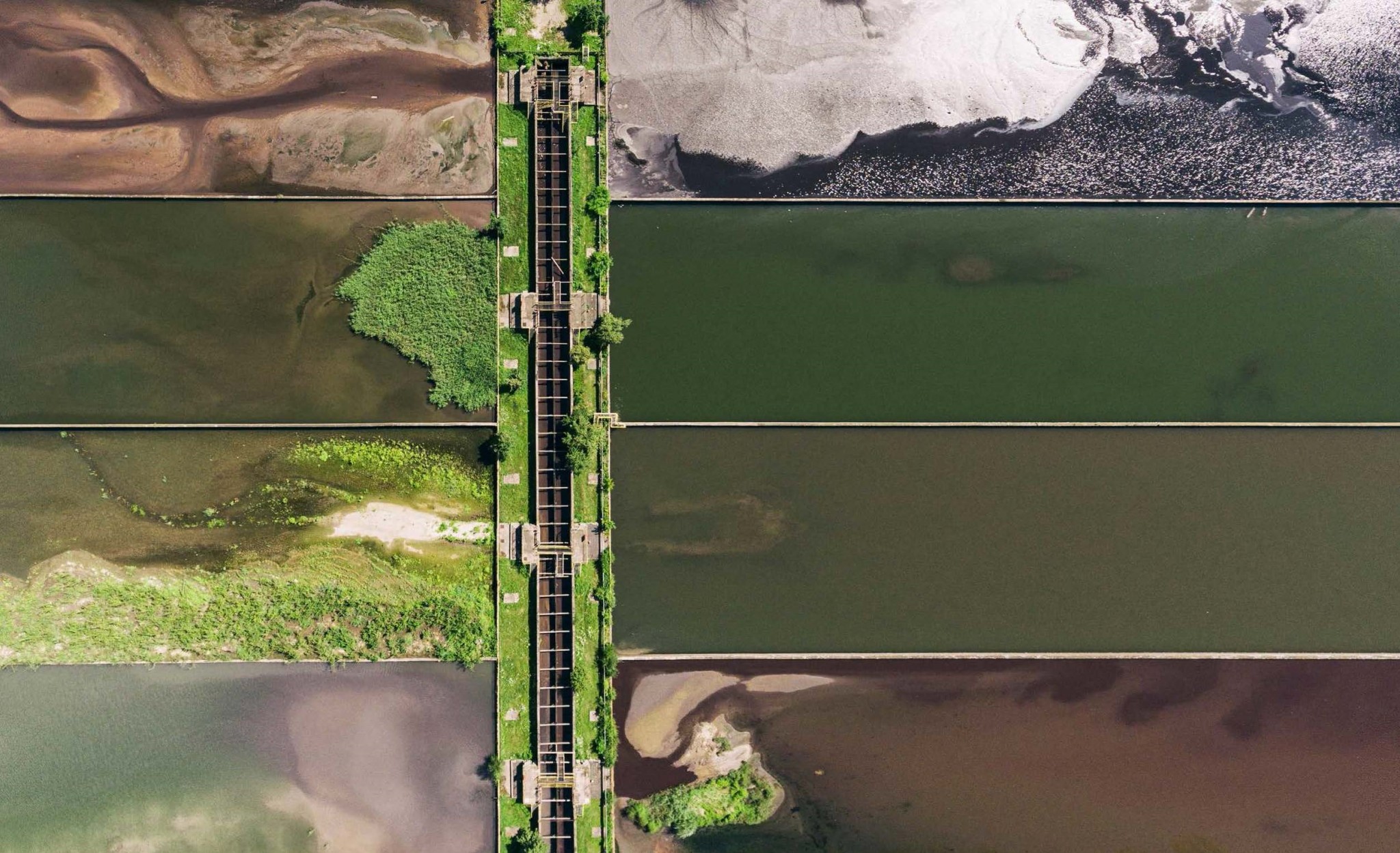 Открывает галерею индустриальных орнаментов сталелитейный завод в польском городе Катовице. Построен он при содействии советского пролетариата, Леонид Ильич Брежнев получил звание первого рабочего завода. Завод большой и в картинку не влез, да и ничего там нет интересного, кроме дыма (дым мы в следующий раз напечатаем). На снимке же, сделанном дроном, запечатлен седиментационный бак. Похоже на название андеграундного ночного клуба, но в реальности так зовется один из ключевых этапов очистки производственных отходов. Так и хочется сорвать рубаху и нырнуть в такой пестрый бассейн! И вынырнуть уже супермутантом.