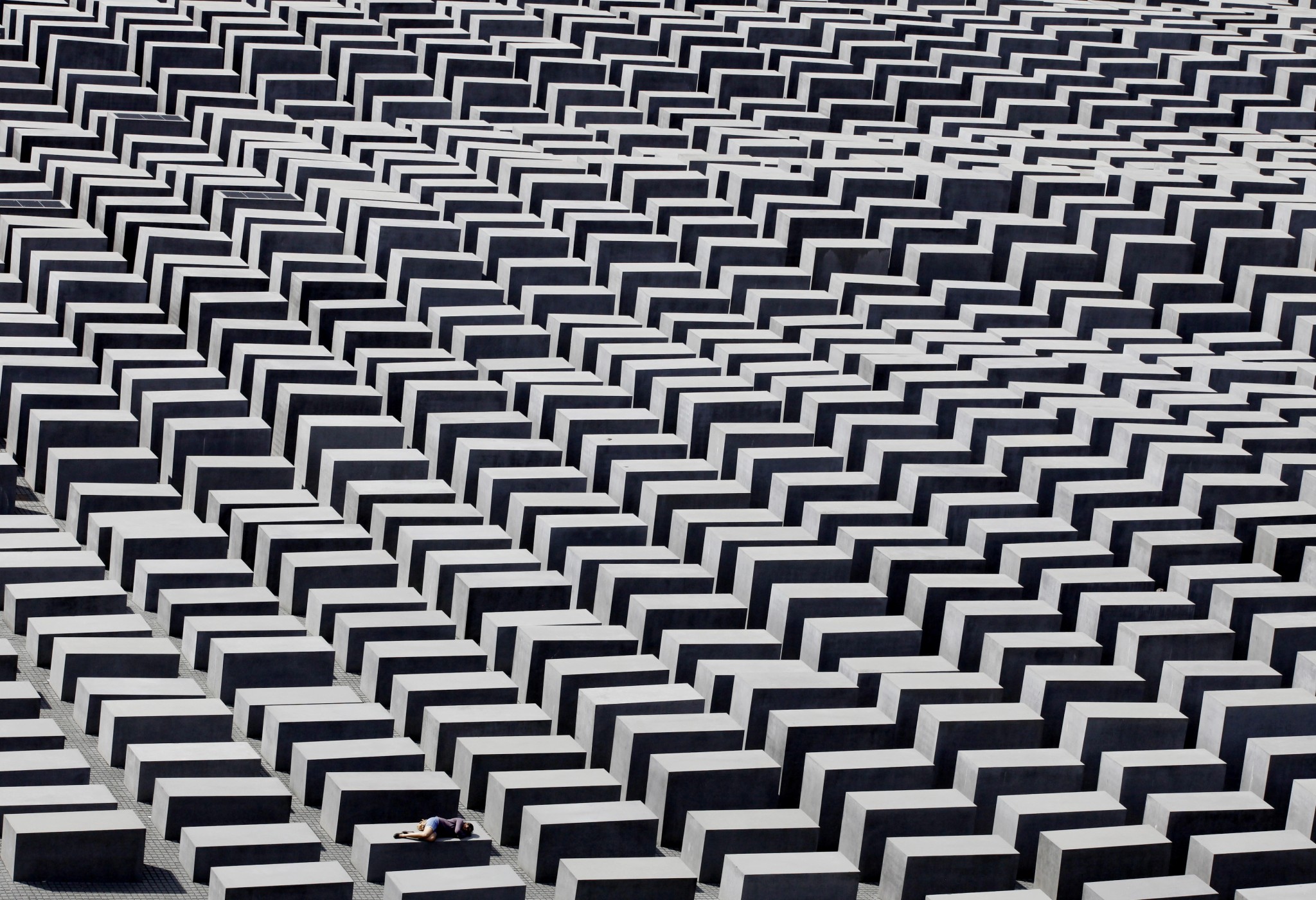 Мемориал жертвам Холокоста – скопище не совсем уж одинаковых бетонных плит общим количеством 2711 в самом центре Берлина. По замыслу это нечто вроде коридоров, разъединяющих людей: проходы между стелами слишком узкие для прогулок вдвоем, так что посетитель чувствует себя брошенным и беспомощным.