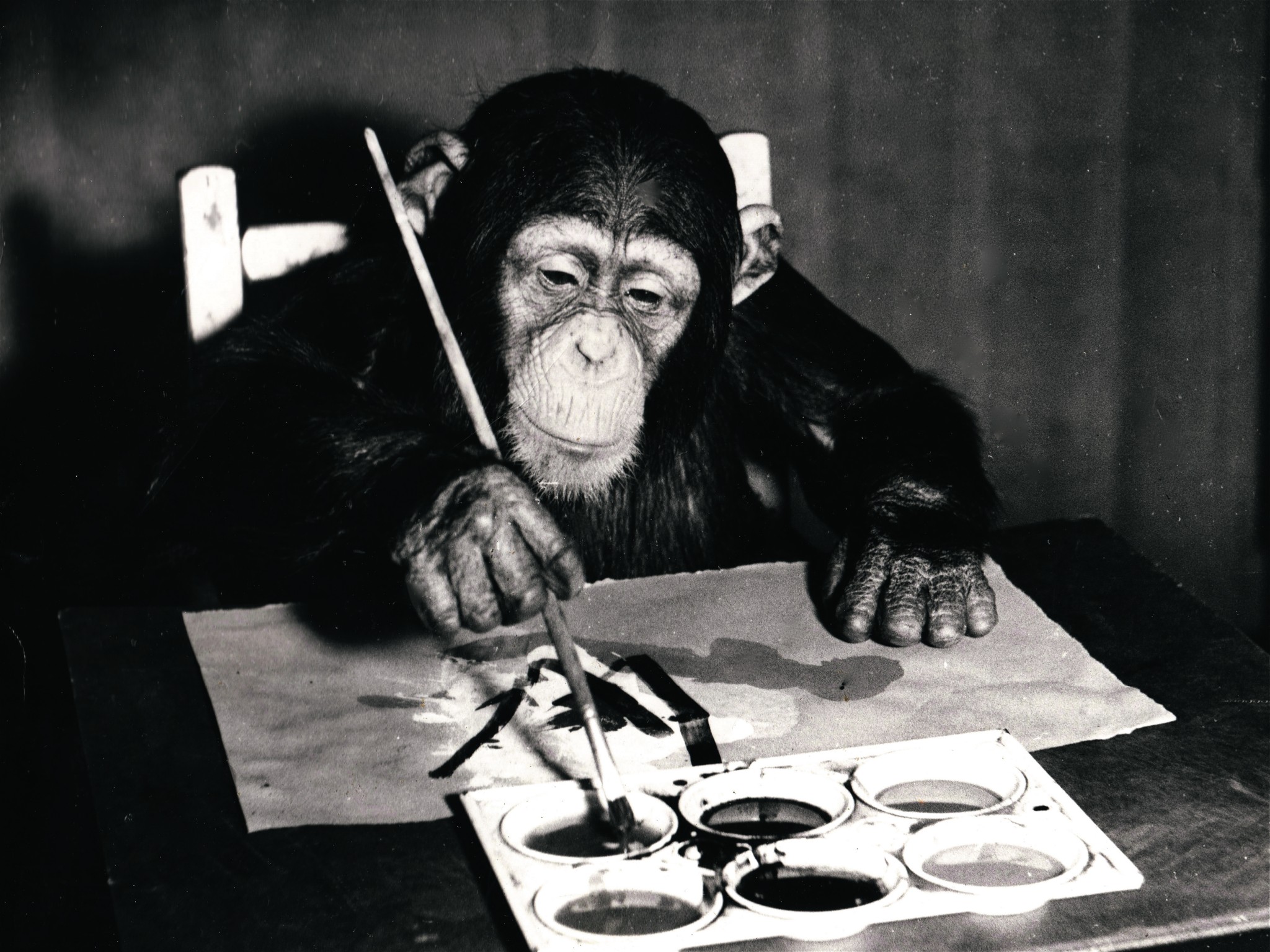 Ни одно животное не может рисовать. Оно может красиво раскладывать камешки, играть с красками, украшать свое гнездо ягодами, но ни одно животное пока не сумело нарисовать цветок, домик или собачку. Даже знаменитый шимпанзе-художник Конго, чьи работы до сих пор продаются на солидных аукционах, всего лишь размазывал по холсту красивые яркие краски, чувствовал симметрию и умел рисовать круг, но он так и не попытался запечатлеть на полотне символ чего-то реального.