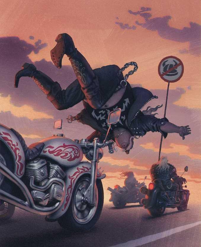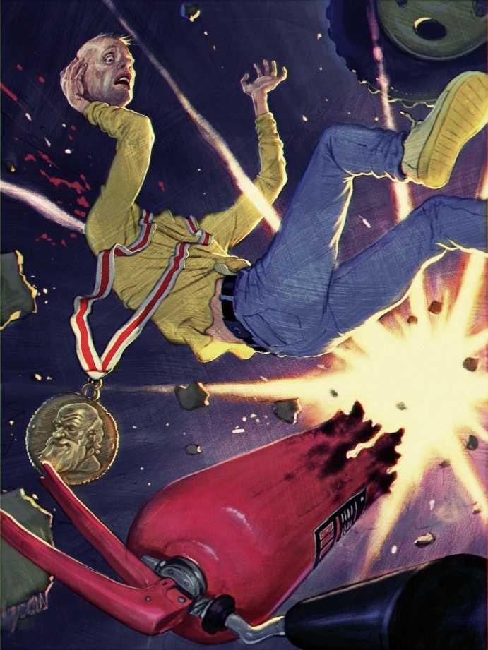 Мало кто готов спорить с тем, что американские байкеры — крутые ребята и могут следовать тем законам, которым они желают следовать. И только старушка физика твердых тел всегда готова постоять себя. Иногда ей даже приходится заявлять свои права на демонстрации. Именно это произошло в июле 2011 года, когда 55-летний мистер Филип Контос, один из лидеров мотопробега «За отмену обязательного ношения шлема во время езды на мотоцикле в штате Нью-Йорк», в ходе проведения акции резко затормозил, перелетел через руль своего двухколесного транспортного средства, перешел в свободное падение и погасил энергию ускорения непосредственно головой, на которой отсутствовал шлем. Тут на помощь законам физики пришел закон Дарвина, и мистер Филип Контос скоропостижно скончался в результате тяжелой черепно-мозговой травмы. Старший брат мистера Контоса подтвердил, что эволюция не ошиблась с выбором в отношении их семейки. По итогам этого инцидента он заявил журналистам, что «как гражданин свободной страны, Фил умер в борьбе за свои права, и, если бы у него был выбор, он сделал бы это снова». Бесспорная и заслуженная премия Дарвина 2011 года!