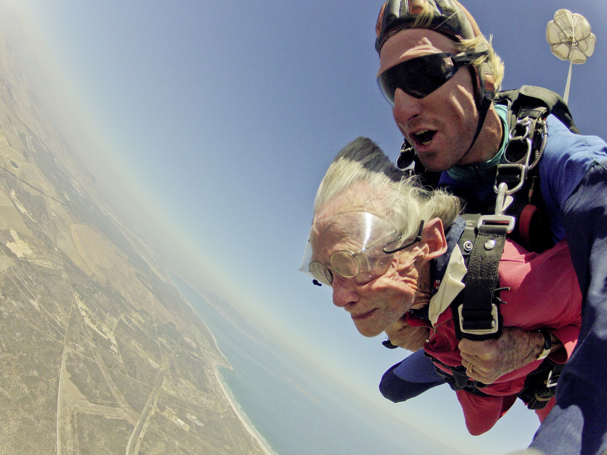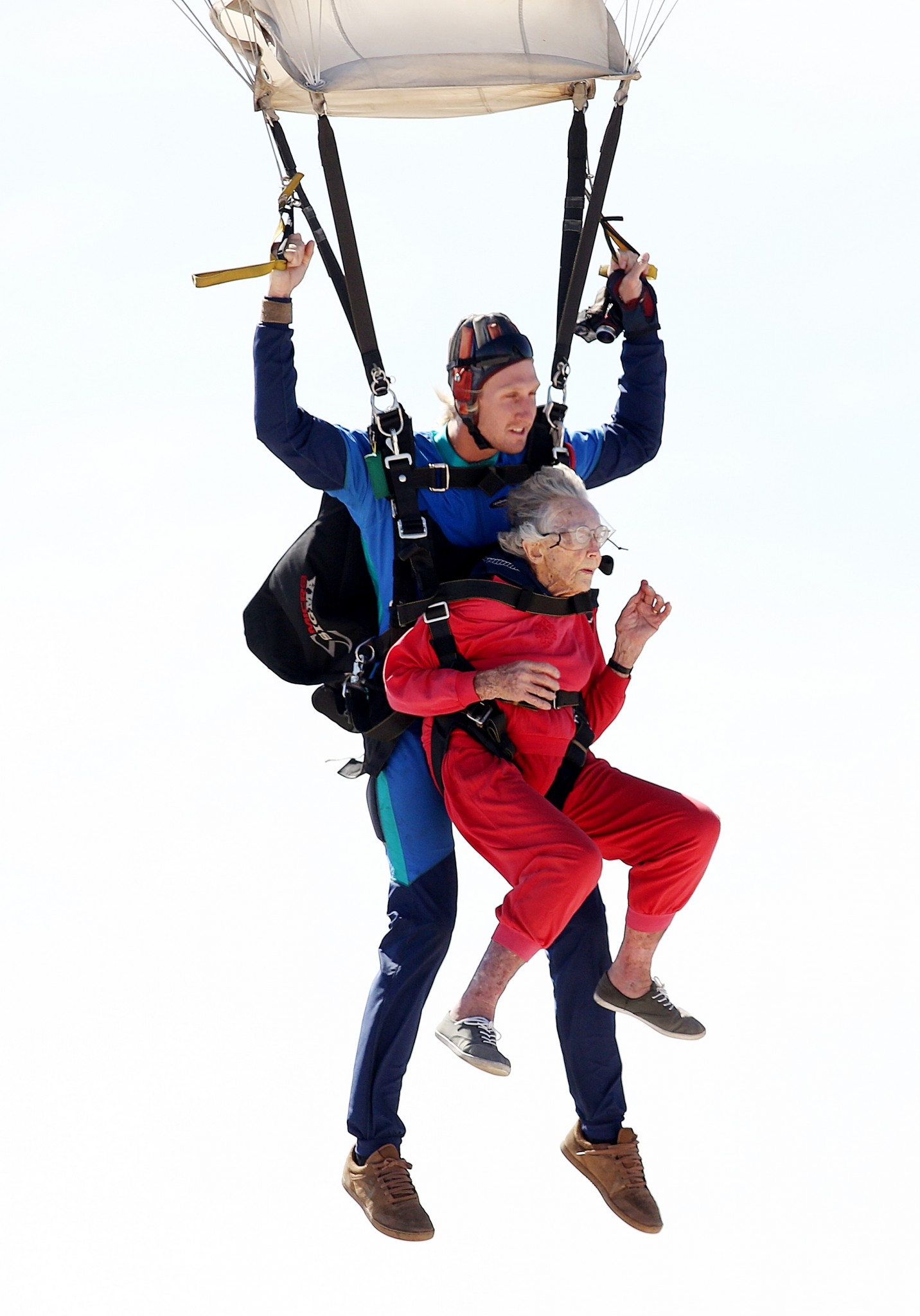 Джорджина Харвуд родилась в Южной Африке в 1915 году. Она была весьма бойкой девицей и даже стала одной из первых женщин – выпускниц Кейптаунского университета. Однако вскоре после окончания учебы Джорджина вышла замуж, и дальше ее жизнь ничем не отличалась от размеренного существования прочих южноафриканских белых матрон. Четыре собственных ребенка, затем внуки и даже правнуки… В 90 лет старушка вдруг осознала, что будни домохозяйки не предел ее мечтаний, и завела себе необычное хобби. Она начала прыгать с парашютом! Впрочем, Джорджина по-прежнему никуда не торопилась: свой первый прыжок она совершила в 92 года, второй – в 97 лет. К празднованию трехзначного юбилея престарелая парашютистка подошла с особым размахом: она совершила свой третий, рекордно затяжной, прыжок, после чего погрузилась в океан в клетке, окруженной акулами, и поднялась на вершину Столовой горы, где в ее честь была устроена вечеринка. Меньше всего энтузиазма от происходящего, вероятно, испытывал парашютист, в тандеме с которым старушка летела вниз. Вот вышел бы конфуз, если бы Джорджина вместо приземления решила отлететь в мир иной. Однако все закончилось хорошо. Опустившись прямо в эпицентр собранной по такому случаю конференции, именинница заявила журналистам: «Прыжки с парашютом позволяют мне вновь почувствовать всю полноту жизни!» Заряда бодрости хватило еще на три года: в 2018 году пенсионерка-парашютистка мирно скончалась во сне.