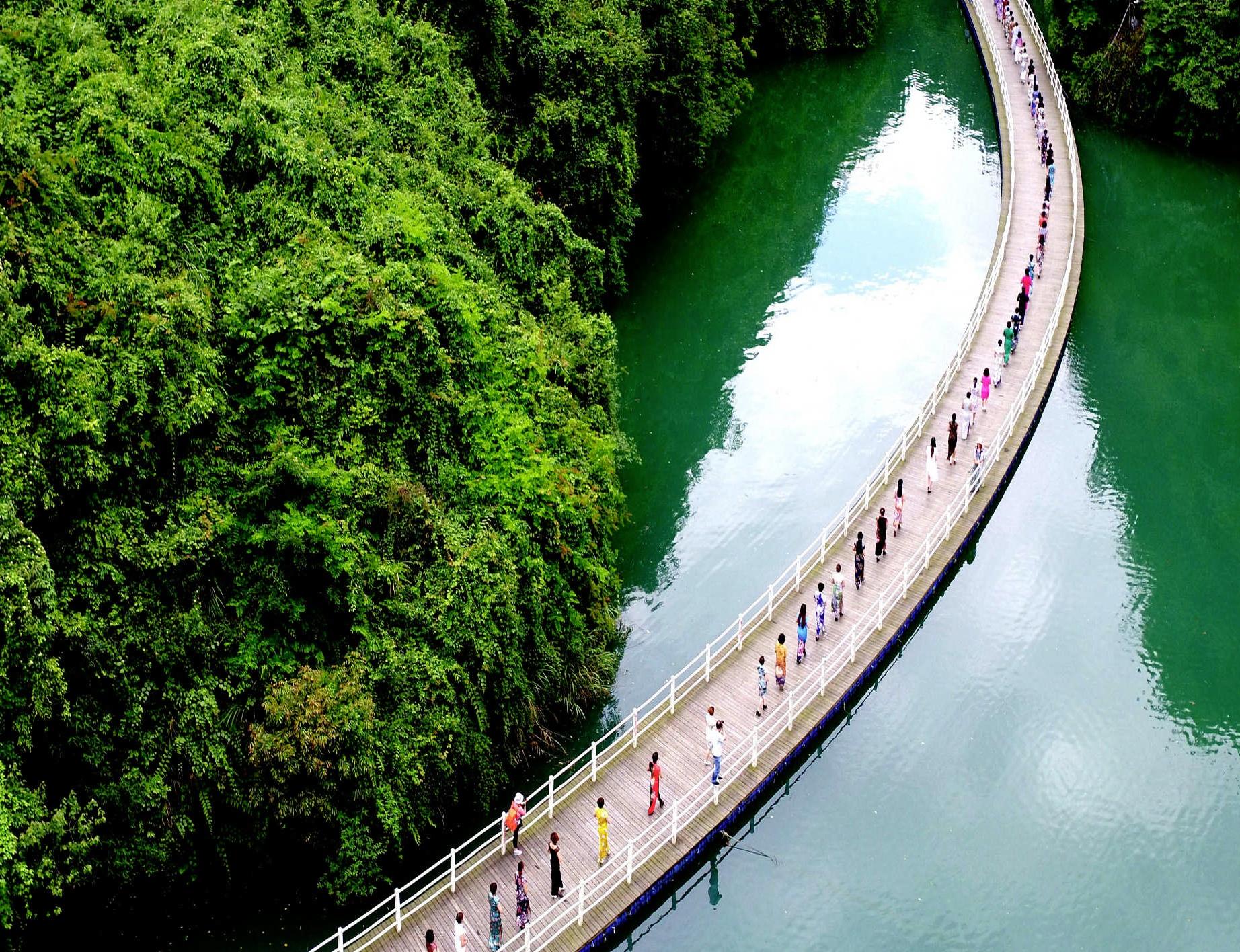 Китай озадачен теми же извечными вопросами, что и Федеральное агентство по туризму в России. Наши мечтают затащить туриста в Крым и Дагестан, а китайцы – в непроходимую глушь и провинцию, в городки с таким названием, что и по-русски-то не выговоришь. На реке Кинг, неподалеку от селения Ши Ци Гуань, в прошлом году был открыт дивный декоративно-прогулочный мост. Деревянный пятисотметровой длины настил выстроен таким образом, чтобы, гуляя по нему, ты мог видеть буйную красоту местной природы. Особая прелесть заключается