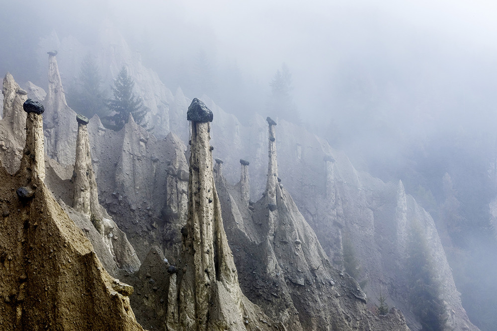 Признаться, мы были уверены, что такие странные горы бывают только в компьютерных играх. В Италии вот компьютеров нет, а подобные горы очень даже есть. Их называют Земляными столбами Ренона, вершины достигают 40 метров, то есть как типовая шестнадцатиэтажка. Исходным материалом для столбов послужила глина, которая со времен ледникового периода застыла в непринужденной позе. Валуны-шляпы надеты далеко не на каждую из 150 скал, придется побегать