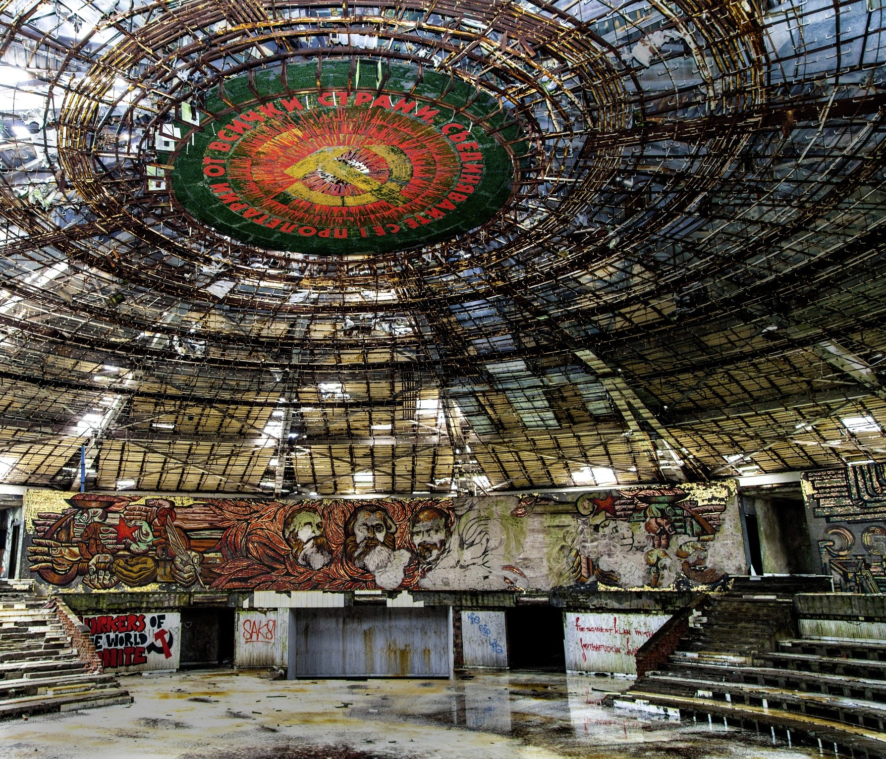 Да, таинственная летающая тарелка – это очередной обломок коммунистического прошлого. В 1891 году на вершине Бузлуджи прошла тайная встреча болгарских коммунистов, которые учредили местную социал-демократическую партию. Когда коммунизм стал главенствующей идеологией в стране, то, чтобы обозначить историческую веху на горе, решили построить нечто монументальное, дорогостоящее и малофункциональное. Выбор пал на торжественный зал собраний в форме летающей тарелки, украшенный мозаикой из полудрагоценных камней, золота и серебра. Все это великолепие служило для съездов партийных лидеров по памятным датам, приема болгарских школьников в пионеры и вывоза на свежий горный воздух иностранных делегаций. В общем, до 1989 года у памятника была активная общественная жизнь. А потом... Потом про него просто забыли. Постепенно внутрь начали забираться мародеры, которые поотбивали драгоценную мозаику, вытащили всю мебель и даже вытянули электрический кабель из стен. Сегодня монумент Бузлуджа изнутри представляет собой классическое апокалиптическое зрелище: пол засыпан обломками, осколками и обрывками, на стенах едва видны смутные контуры лиц вечно молодых строителей коммунизма и вечно бородатых Ленина, Маркса и Энгельса. Сквозь дырявый купол крыши падают косые лучи света, а в самом центре ее все еще сохранился таинственно поблескивающий древний агностический символ – серп и молот.