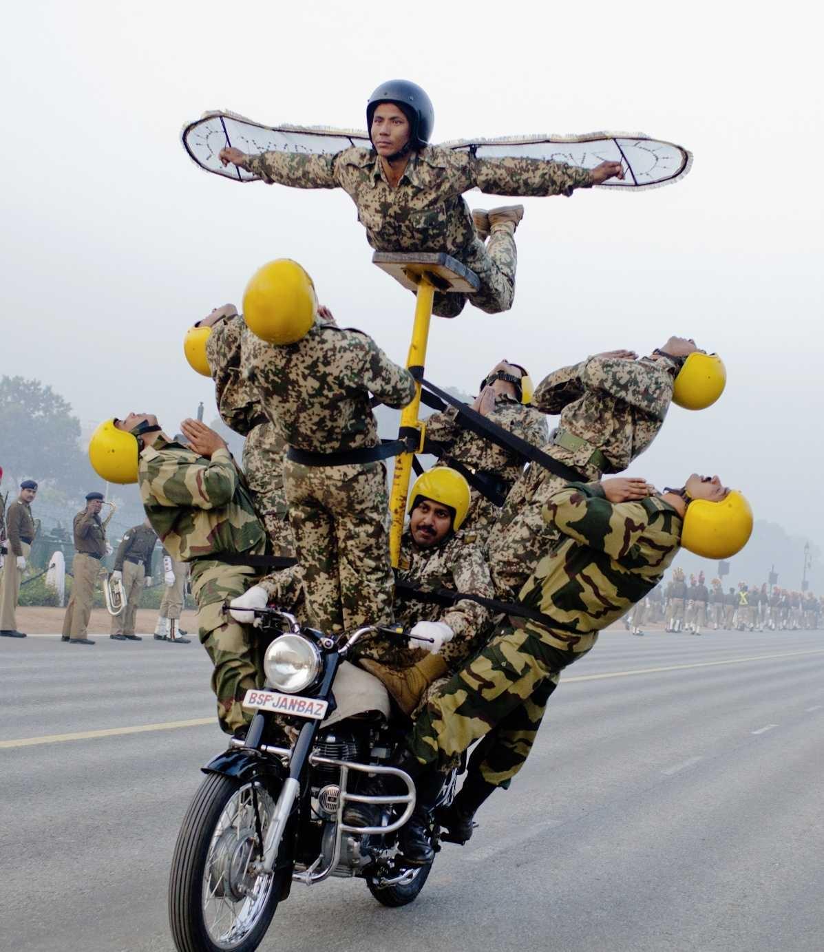 Солдаты Индии репетируют номер армейской художественной самодеятельности к Дню Республики (он празднуется 11 января). Гвоздем номера должны стать трюки на мотоциклах, которые выглядят уморительно смешно. Хотя, если задуматься, опасности и риска в этой затее куда больше, нежели юмора. Что символизирует окрыленный витязь в центре композиции, нам доподлинно неизвестно. Но, судя по тому, что другие на него молятся, он пилот самолета снабжения, везущий продукты и посылки родителей.