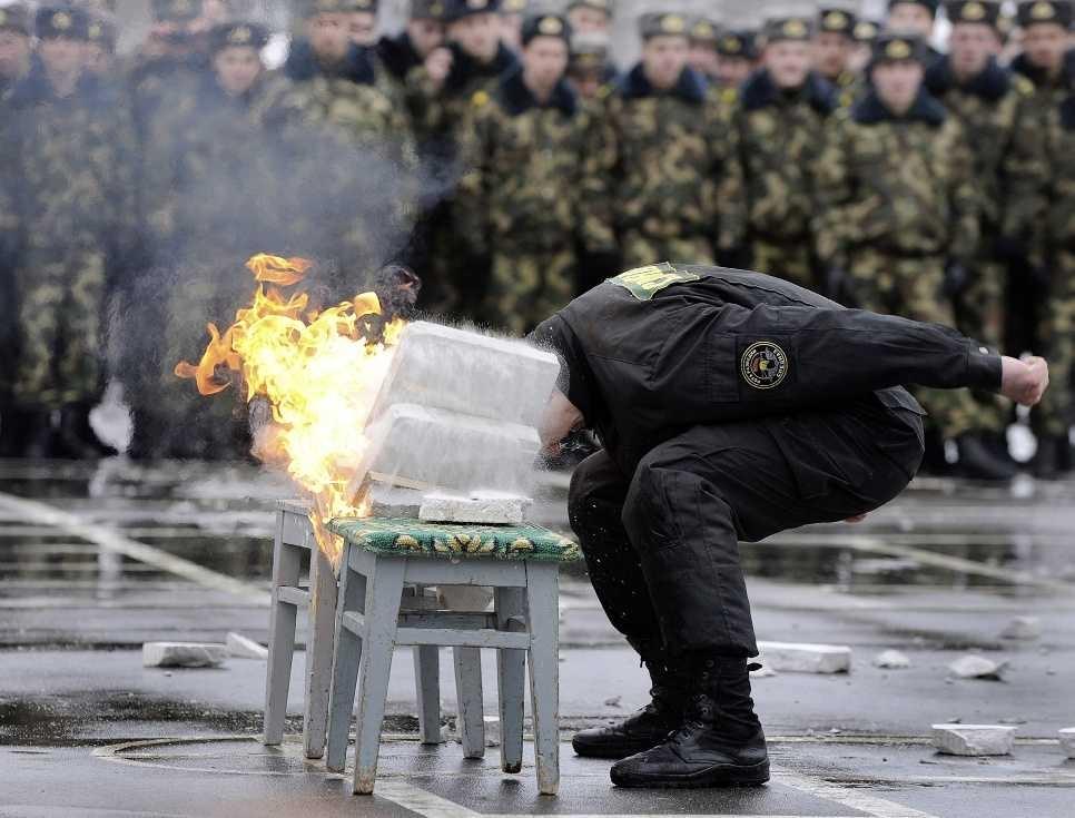 Белорусская армия использует любой повод, даже мирный, чтобы превратить его в военный праздник. Запечатленные на снимке показательные выступления сотрудников Министерства внутренних дел Республики Беларусь приурочены к проводам зимы. Нам кажется, есть смысл перенести это шоу на пару месяцев назад: увидев, как дикие люди крушат головами горящие плиты, даже самая крепкая зима в ужасе сбежит из Белоруссии, не дожидаясь начала весны.