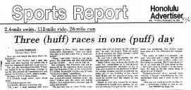 В 1977 году на Гавайях разгорелся нешуточный спор. На финише любительского забега Oahu Perimeter Relay обсуждали, кто же самый выносливый – бегун, пловец или велосипедист. Большинство собравшихся оказались морскими пехотинцами, поэтому вместо мордобоя и поножовщины решили защитить честь любимого вида спорта в гонке, сложив длинные дистанции каждого в одну непрерывную. 18 февраля 1978 года состоялась первая официальная гонка. На дистанцию вышли 15 человек, закончили ее – 12, а выиграл марафон военный в отставке, работавший на тот момент таксистом. Его результат – 11 часов 46 минут 58 секунд.