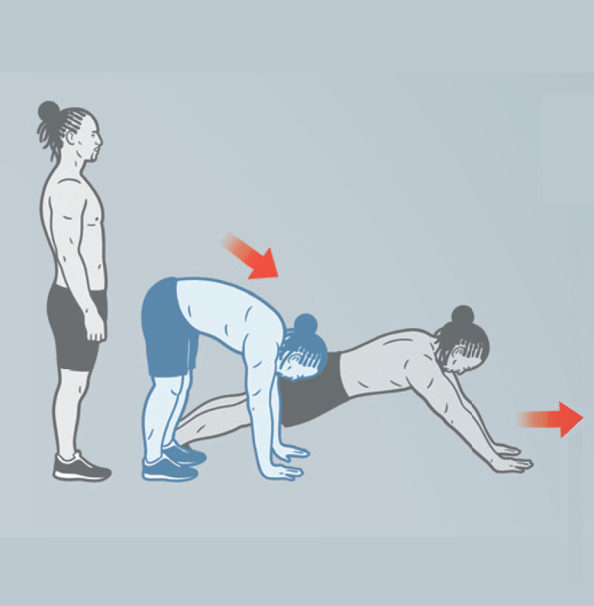 Поставьте ноги на ширину бедер. Затем наклонитесь вперед и поставьте руки на пол. Перебирая руками по полу, опуститесь в планку. Затем,переступая ногами, вернитесь в исходное положение. Следите за тем, чтобы не округлять спину.