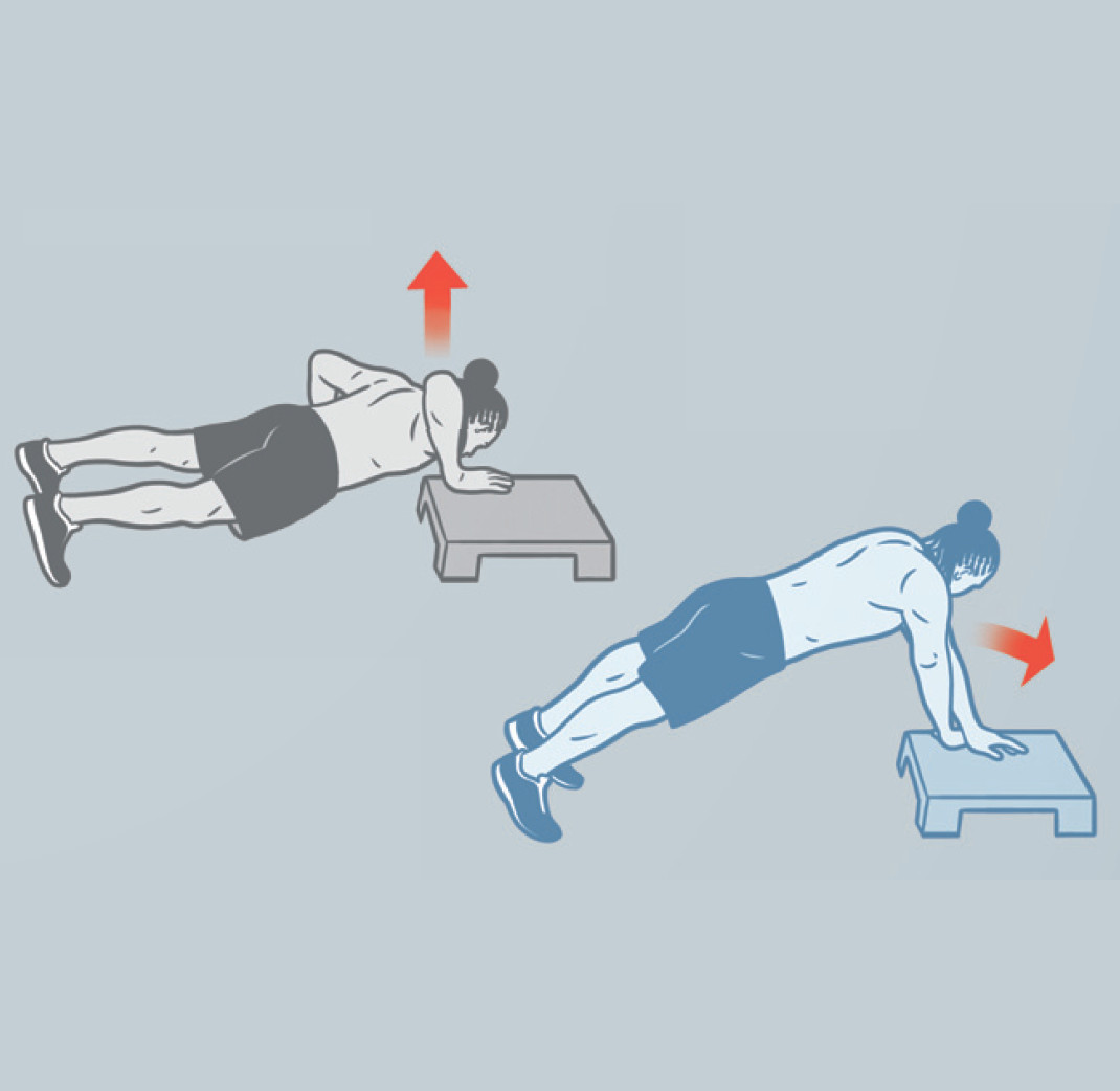 Встаньте в исходное положение для высокой планки. Одну из рук поставьте на подставку. Отжимаясь, сместите тело в сторону подставки и переставьте ту руку, которая стоит на полу, на подставку (как на рисунке). Повторите. Переходя к следующему кругу, смените руку.