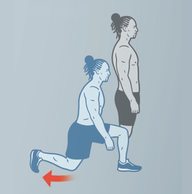 Левой ногой отшагните назад и опуститесь в выпад. Левое колено почти у пола, правое — под углом чуть более 90°. Замрите на указанное время. На следующем круге смените ногу