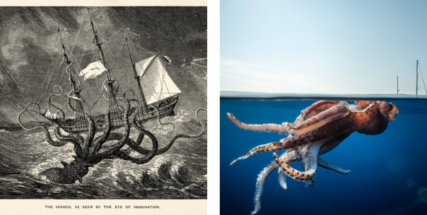 По морским легендам, кракен — это плотоядное чудовище с щупальцами. Причем их так много и они такие сильные, что могут захватить и потопить абсолютно любой корабль. А еще кракен мог создать чудовищный водоворот, просто плавая вокруг судна. И скорее всего, легенды о таких поразительных созданиях появились после того, как люди увидели гигантского кальмара (Architeuthis dux). Представители