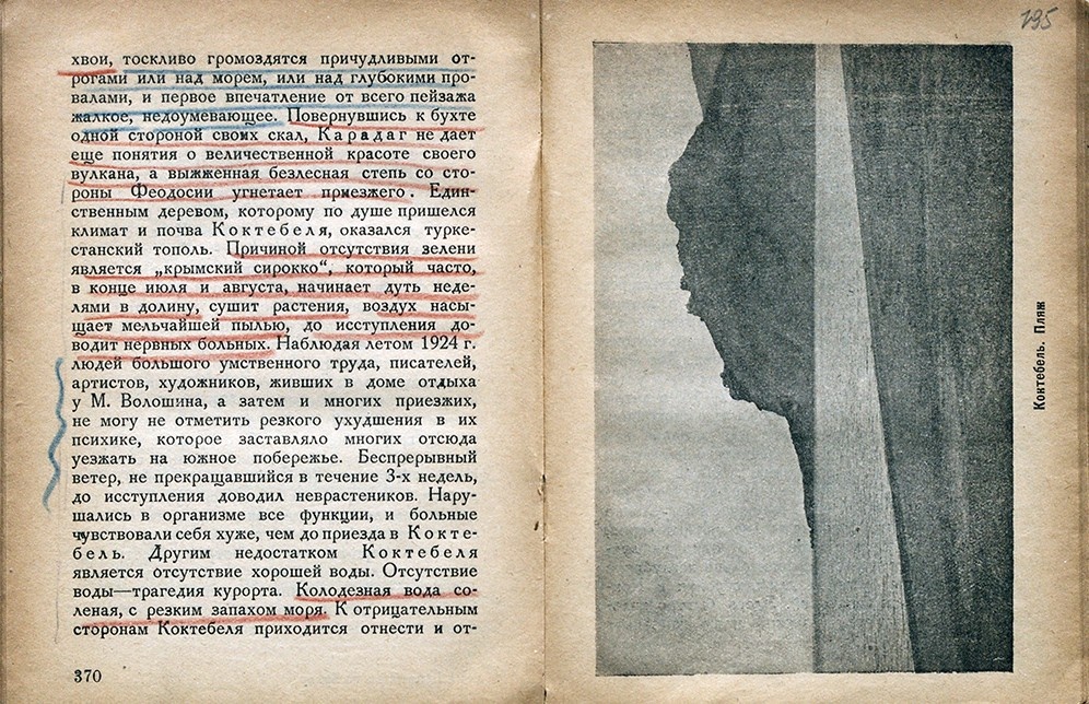 Дома при опостылевшем свете рабочей лампы раскрыли мы книжечку и увидали на странице 370-й («Крым». Путеводитель. Под общей редакцией президиума Моск. Физио-Терапевтического Общества и т.д. Изд. «Земли и Фабрики») буквально о Коктебеле такое: