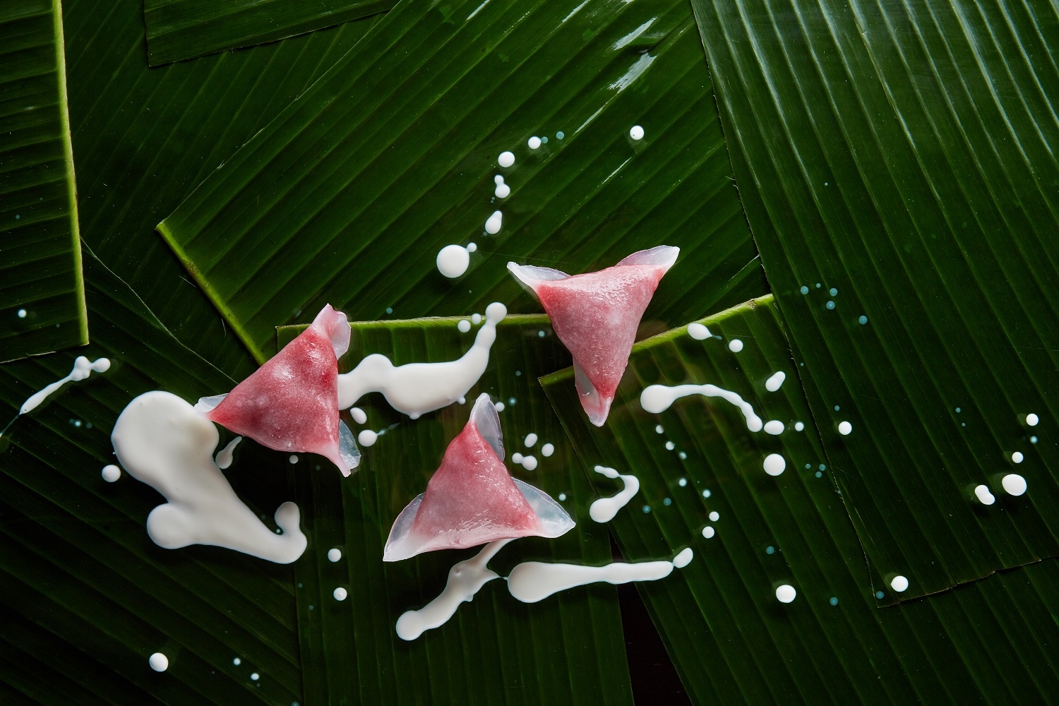 Способ приготовления: Вишню растопить. Банан пробить в блендере с малиной. Добавить к вишне сахар и бананово-малиновое пюре. Полученную смесь потушить 7-10 минут на слабом огне. Крахмал развести водой, поставить на плиту и довести до загустения. Отщипнуть 10 г теста, сформировать шар и раскатать. В центр полученной лепешки положить вишневую начинку (18 г), защипнуть края. Готовить в пароварке в течение 3-4 минут.
