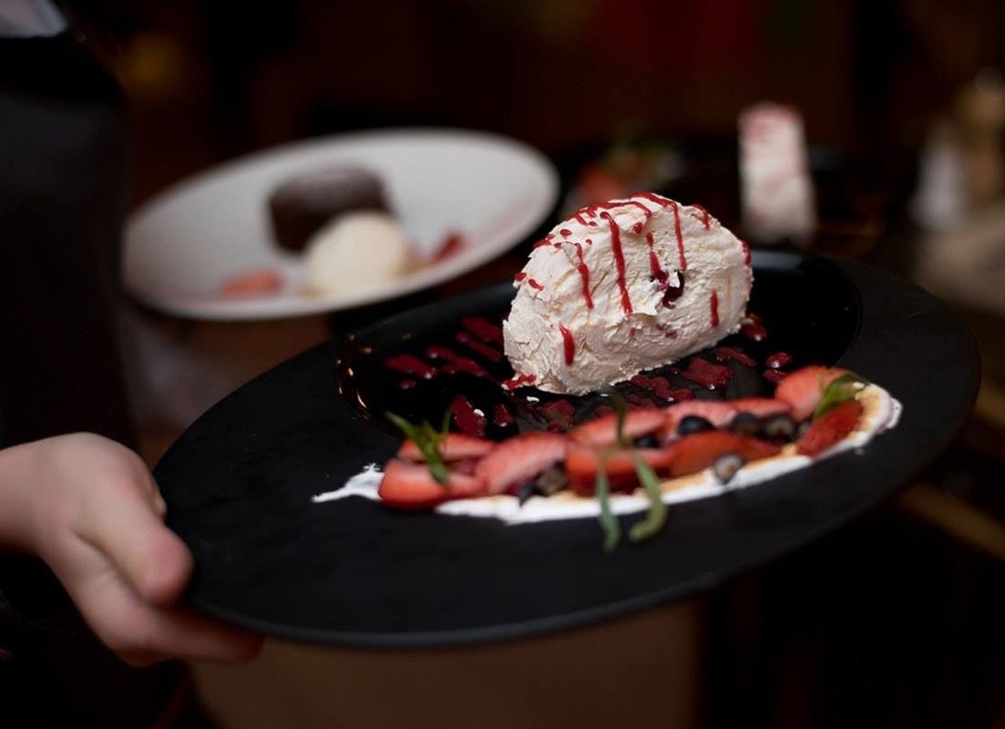 Пирожное «Анна Павлова» с заварным белком, ягодами и малиновым соусом