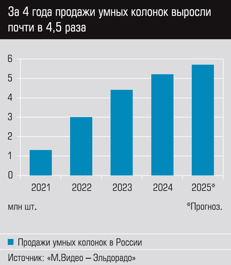 Споры о возможных шпионских свойствах умных колонок стали уже весьма жаркими, и немудрено: устройств такого типа на рынке появляется все больше. По подсчетам «М.Видео — Эльдорадо», за первое полугодие 2025 года в России было куплено 2,5 млн умных колонок на 22,2 млрд рублей — это соответственно на 12 и 10% больше, чем за аналогичный период 2024-го. В последние пять лет торговля умными колонками в России в штучном выражении расширилась почти в четыре с половиной раза: если в 2021 году в стране было продано 1,3 млн таких девайсов, то до конца текущего года этот показатель предположительно достигнет 6 млн (см. график).