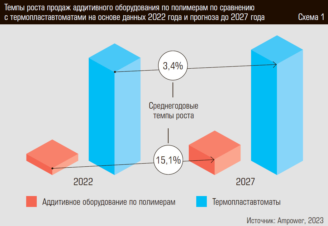 Усредненные темпы роста продаж аддитивного оборудования по полимерам с 2022 по 2027 год составляют 15,1% по сравнению с 3,4% традиционных термопластавтоматов (см. схему 1).