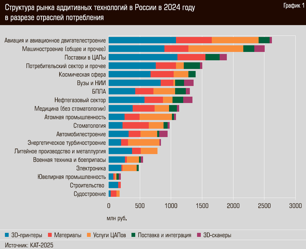 Российский рынок аддитивных технологий в 2024 году обрел четкие очертания, и исследование однозначно выявило его главные драйверы. Бесспорными лидерами потребления, инвестировавшими в эту сферу колоссальную сумму — 2,6 млрд рублей, стали авиационная отрасль и двигателестроение. Эти направления, активно использующие АТ, устанавливают для этой сферы высочайшую планку требований. Основной фокус здесь сосредоточен на промышленной металлопечати, прежде всего на технологиях лазерного сплавления порошка (L-PBF) для изготовления сложных топологически оптимизированных деталей силовых конструкций и прямом подводе энергии (DED) — для ремонта и восстановления дорогостоящих компонентов турбин и создания крупногабаритных элементов. Не менее важна роль высокопрочных, термостойких полимеров (таких как PEEK и PEKK), применяемых для интерьерных деталей, воздуховодов и элементов систем управления. Ключевым звеном в этой цепочке выступают центры аддитивных технологий, на которые приходится значительная часть заказов на производство сертифицированных летных изделий, требующих глубокой экспертизы и специализированного оборудования.