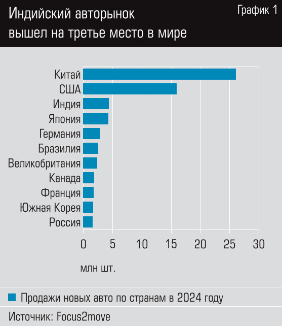 В прошлом году Индия неожиданно для многих поднялась на третье место в рейтинге автомобильных держав. По данным международной консалтинговой компании Focus2move, общемировые продажи новых машин в 2024 году достигли 85,1 млн единиц (+2,6% по сравнению с 2023-м). Лидирует в списке Китай с объемом продаж в 26,05 млн авто (+3,4%). Далее идут США — 15,9 млн (+3,6%). На третьей строчке обосновалась Индия с 4,27 млн (+3,9%), оставив позади падающий рынок Японии (4,25 млн штук, минус 7,1%). За ними следуют Германия (2,8 млн), Бразилия (2,4 млн) и Великобритания (2,3 млн). Россия с показателем в районе 1,6 млн единиц заняла 11-е место, немного уступив Южной Корее (см. график 1).