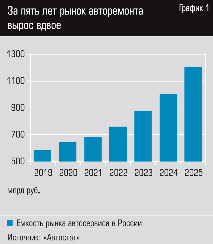 «Любишь кататься, люби и ремонтировать», — все чаще горько шутят владельцы автомобилей в России. На фоне сокращения продаж новых машин автопарк стремительно стареет: по данным ассоциации «Российские автомобильные дилеры» (РОАД), в 2025 году доля легковушек старше 10 лет в стране достигла 72% (48% в 2015 году). Такое положение закономерно стимулирует рост рынка техобслуживания: по информации «Автостата», в 2025 году сегмент сервисных услуг для легковых машин в России оценивался в рекордные 1,204 трлн рублей. Это на 20% больше, чем в 2024-м, и почти вдвое превышает уровень пятилетней давности (642 млрд) — см. график 1.