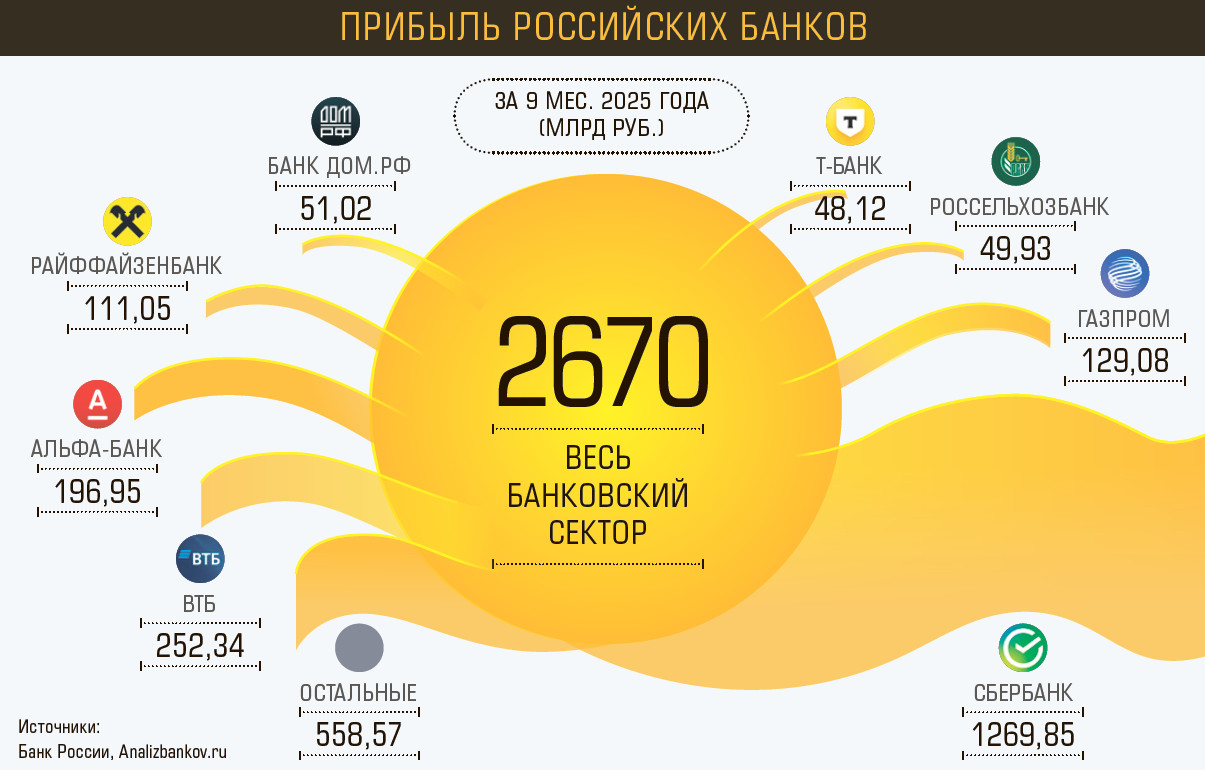В 2025 году банки совершили настоящее финансовое чудо: на фоне замедления корпоративного кредитования и падения потребительского они смогли заработать почти столько же, сколько в рекордном 2024-м. Чистая прибыль банковского сектора за январь–октябрь текущего года составила примерно 3 трлн рублей, это лишь немногим меньше, чем 3,1 трлн за тот же период 2024-го. Согласно отчетности банков на сайте ЦБ, Сбербанк за 10 месяцев этого года заработал 1,42 трлн рублей (почти половину всей прибыли сектора), ВТБ — 265 млрд, Т-Банк — 67,6 млрд, Совкомбанк — 19 млрд.
