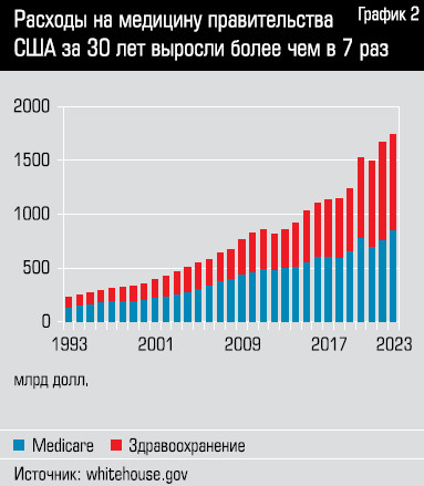 Программа Medicare была открыта в 1965 году как федеральная программа медицинского страхования для людей в возрасте от 65 лет и молодых людей с ограниченными возможностями. В 2022 году Medicare предоставила медицинскую страховку 65 млн человек, а их расходы, которые подлежали возмещению, превысили 900 млрд долларов. Нужно отметить, что доля Medicare в расходах федерального бюджета с годами становится все внушительнее: в 1986 году, через двадцать лет после начала действия программы, она составляла 7% от расходов, в 1996-м уже 11%, а к 2024 году доросла до 14%.