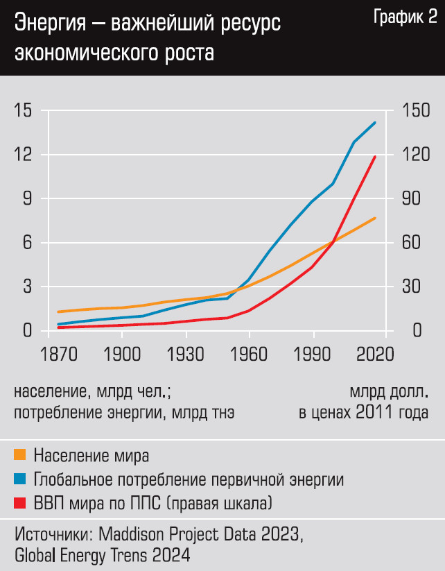 Начнем с анализа взаимоотношений между энергетической системой и глобальной экономикой на длинных горизонтах, по мере роста численности населения Земли. За последние 150 лет население мира выросло в шесть раз, а масштаб мировой экономики, измеренный ВВП по паритету покупательной способности, — в 60 раз (соответственно, душевой ВВП в среднем по миру вырос на порядок). При этом потребление первичной энергии за полтора века (1870–2020-е годы) выросло чуть больше чем в 33 раза (см. график 2). То есть потребление энергии на душу населения, своего рода «энерговооруженность» жителя Земли, выросло в пять с половиной раз, а вот удельная энергоемкость экономики изрядно снизилась — почти вдвое (на 45%).