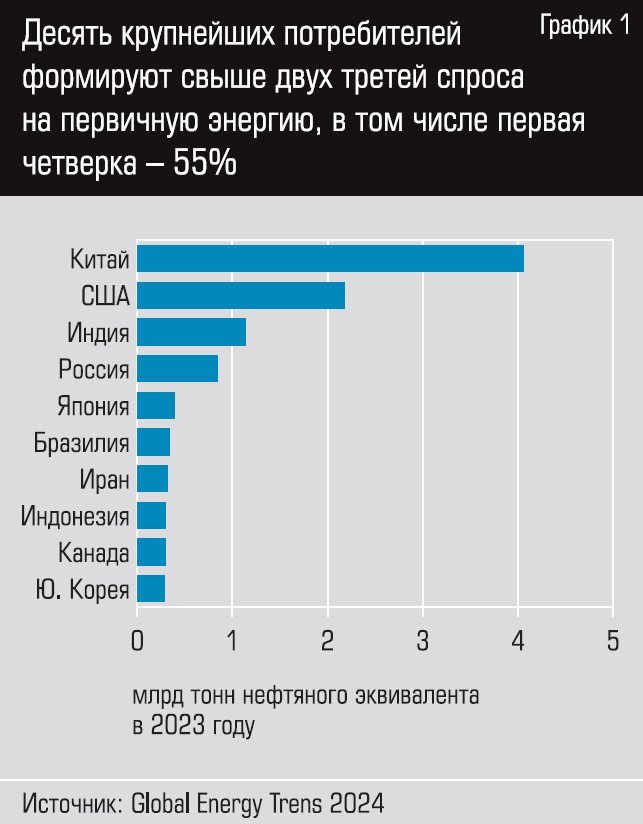 Более 80% мирового спроса на энергоносители приходится на развивающиеся страны, развитые страны сокращают энергопотребление. При этом крупнейший энергопотребитель мира — Китай (на него приходится 27% суммарного потребления первичной энергии, см. график 1) — демонстрирует тенденцию перехода от «развивающейся» динамики к «развитой»: в 2024 году эта страна нарастила энергопотребление на 3%, что существенно ниже средних 4,3% за последние годы.