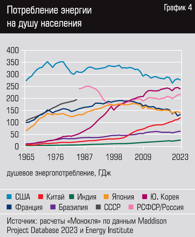 В развивающемся мире мы видим две принципиально разные модели динамики душевого потребления. Первая модель — крайне энергичный рост, замешанный на фронтальной индустриализации. Всего за 20 лет, с 1977-го по 1997-й, потребление энергии в Южной Корее на душу населения подскочило впятеро, с 33 до 167 ГДж (см. снова график 4). После заминки, вызванной азиатским кризисом, показатель продолжил расти, хотя и не такими впечатляющими темпами, в последние годы выйдя на плато в районе 240 ГДж. Аналогичный рывок, только со сдвигом на четверть века, совершил Китай: здесь душевое энергопотребление увеличилось с 2001-го (год присоединения КНР к ВТО) по 2023-й в 3,4 раза — с 35 до 120 ГДж. Население Китая больше не растет, а абсолютное потребление энергии, как мы отметили в начале этого материала, быстро увеличивается. Соответственно, душевое энергопотребление продолжит здесь энергично расти, оно еще далеко от уровня насыщения (ровно вдвое уступает современному уровню Южной Кореи).