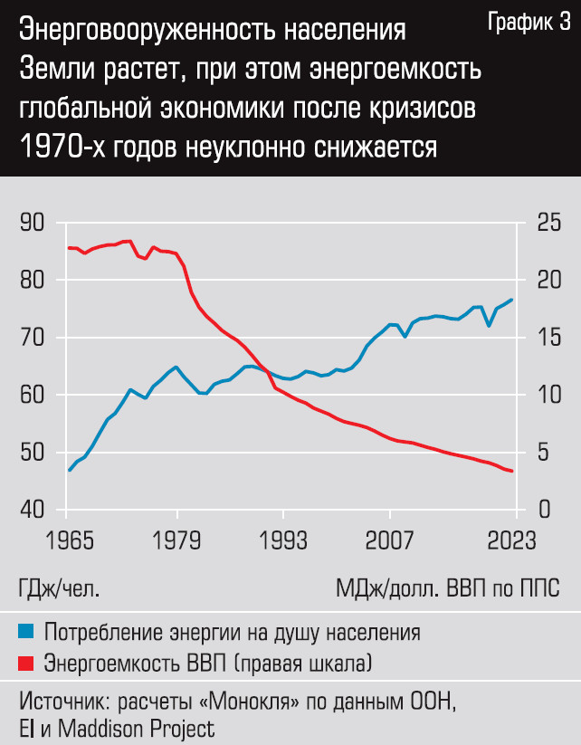 Конечно, за 150 лет зависимости между динамикой энергопотребления, численностью населения и масштабом экономики претерпели существенные изменения. Еще в начале 1970-х рост потребления энергии примерно пропорционально росту ВВП считался нормой: энергоемкость глобальной экономики оставалась примерно постоянной, а душевое потребление энергии быстро росло, чему способствовали бросовые, по нынешним меркам, цены на нефть. Понадобился шок энергокризисов 1973 и 1979 годов, чтобы сменить расточительную модель энергопотребления на сберегающую: энергоемкость глобального ВВП за последние 50 лет снизилась в 6,9 раза, при этом душевое потребление энергии в целом по миру продолжает расти (между 1973 и 2023 годами оно выросло чуть больше чем на четверть), хотя и существенно более низкими темпами, чем в благословенные 1950–1960-е (см. график 3, построенный на основе наших расчетов по базе данных Maddison Project и Energy Institute).