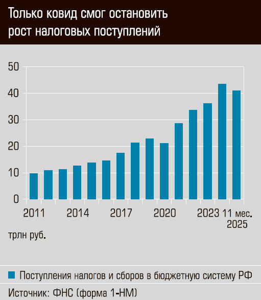 В результате активной модернизации ФНС, в том числе путем цифровых инноваций, поступление налогов в консолидированный бюджет России до 2025 года стабильно росло — с 13,8 трлн рублей в знаковом для начального этапа цифровизации ФНС 2015 году до рекордных 43,5 трлн за 2024 год. Конечно, базовая причина — рост самой экономики и налоговой базы, но поступления увеличивались и в те годы, когда экономика была не в форме, и чаще всего с темпом, превосходящим рост ВВП. За 11 месяцев значительно менее благоприятного 2025 года поступления налогов в консолидированный бюджет уже почти добрались до 41 трлн рублей (см. график). Более того, все это происходило на фоне сокращения выездных проверок. Если в 2015 году было проведено больше 26 тыс. выездных проверок организаций, то 2024-м всего 4500 (3800 за девять месяцев 2025 года). К сожалению, статистика собираемости налогов не публикуется, но и из приведенных данных виден рост эффективности работы ФНС.