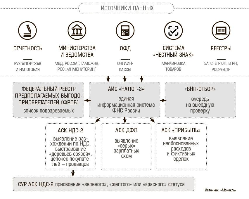 Как ФНС смогла превратиться из части Министерства финансов СССР в современного всевидящего «большого брата»? Началось все это в 1993 году с программы информатизации налоговой службы как части федеральной программы информатизации России. Следующий этап наступил в 1997-м, с появлением концепции создания автоматизированной информационной системы (АИС) «Налог-2». Современный период начался в 2010-м, когда руководителем налоговой службы был назначен Михаил Мишустин, который сейчас занимает должность председателя правительства Российской Федерации. В 2013 году началось тестирование действующей сейчас АИС «Налог-3» и была запущена первая версия Автоматизированной системы контроля за налогом на добавленную стоимость (АСК НДС), еще спустя два года заработала АСК НДС-2. Если первая версия этой системы только создала ощущение наступления новой эры налогового контроля, то вторая действительно ее начала.